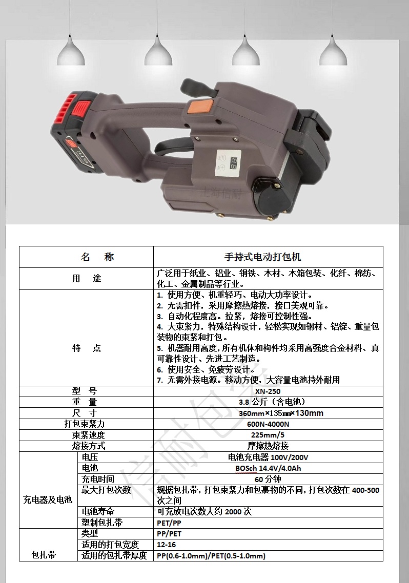 重量3 8公斤(含電池)尺寸360mmX 13 5mmX 1 30mm打包束緊力600N-4000N束緊速度225mm s熔接方式摩擦熱熔接電壓電池充電器100 220V電池14訂購熱線:021-5488-4151