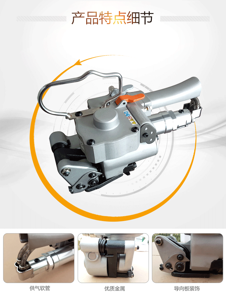 氣動塑鋼帶打包機是一種摩擦熔接型打包機,重疊的熱塑性PP/PET打包帶通過摩擦運動產(chǎn)生的熱量接合,因此稱為“摩擦熔接”。氣動打包機的動力是氣源,因此它能夠捆緊幾噸重的物體而不會散包。氣動打包機根據(jù)使用鐵扣分為氣動鐵扣式打包機和氣動免扣式打包機。  信耐包裝設計的兩款氣動打包機AQD-19型和AQD-25型使用方便、機重輕巧、氣動大功率設計;自動化程度高,拉緊、熔接殼控制性強;機器耐用度高,所有機體和構件均采用高強度合金材料、高可靠性設計、先進工藝制造;專利設計、使用安全、免疲勞設計。  1、氣動塑鋼帶打包機可水平或垂直通過平衡器或重型彈簧吊掛在可旋轉,可移動的橫梁上、上下操作可任意定位,使氣動鋼帶打包機有一定的工作空間(注:分離式不需要通過平衡器或彈簧吊掛裝置)。 2、使用氣動鋼帶打包機時,決不可用可燃氣體,空氣壓縮氣源必須通過油水分離器、壓力調節(jié)閥、油霧器,氣管最好是用外經(jīng)12㎜,內經(jīng)8㎜氣管,承受壓力為0.9Mpa,油霧器內加:22#氣輪機油、60-100號錠子油。   3、氣管的最大工作長度為10米,理想長度在5米內;氣動塑鋼帶打包機的工作摩擦輪壓下的正常工作間隙為0.1-0.3毫米。  4、氣動塑鋼帶打包機的各種運動部位保持潤滑。   5、若氣動打包機收緊力過大或者過小,可使用小螺絲刀調節(jié)氣動打包機的節(jié)流閥。調整時不分方向,轉速聲音越大,拉力越大,反之則小。   6、當氣動打包機使用頻率較高時,每天應在氣動打包機的進氣品滴專用潤滑油,保養(yǎng)機器在,保持6-8公斤的氣壓。   7、要使用氣動打包機前,要認真檢查空氣壓縮機是否正常工作。打包一般產(chǎn)品時,能保持6-8公斤的氣壓即可,打包鋁錠、玻璃產(chǎn)品時,若氣壓調整到9公斤,效果更佳。  8、油水分離器的潤滑器要保持油滿狀態(tài),每天排空過濾器和空氣壓縮機儲氣罐里的水份。