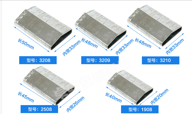 鐵皮打包扣選用專用帶鋼和專用馬口鐵,打包鋼口內有密麻小刺,起到防滑、增加聯系處拉力、 保障貨物安全的效果。打包鋼扣表面鍍鋅,能夠防止生銹。規格在寬度13-19mm, 厚度0.6-1.0mm之間,可根據打包帶規格進行配套使用。 普通鐵皮打包扣是現在市場上用的廢舊易拉罐露露片和八寶粥作為原材料鐵皮制成, 規格12-40mm左右,厚度0.2-0.3mm左右。目前鐵皮打包扣以河南 山東 河北 為主產區, 河南的為上乘產品做工好,物美價廉,但鐵皮打包扣現在被熱合機所代替, 市場保有率也大大降低,不久的將來鐵皮打包扣可能要退出歷史舞臺,這也是必然的趨勢。鐵皮打包扣必須用專用的打包機打包和專用打包帶配套使用。