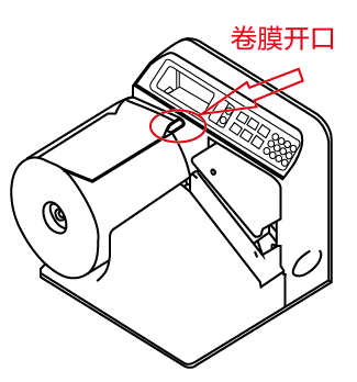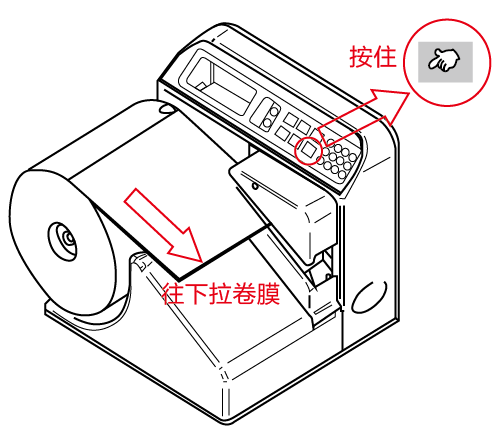 3)用手拉著卷膜進氣孔完成進入氣管頭后,直接穿入進膜槽,然后,一手按著操作面板上黃色的“IN/OUT”(進退膜)按鈕,另一手同時配合著將卷膜從槽內(nèi)拉出。