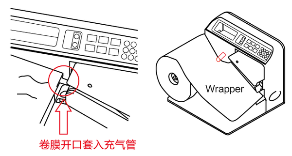 2)把卷膜的進氣孔穿入設備的充氣孔,將膜拉入到進膜槽。進氣孔直接穿過設備的充氣金屬孔即可。